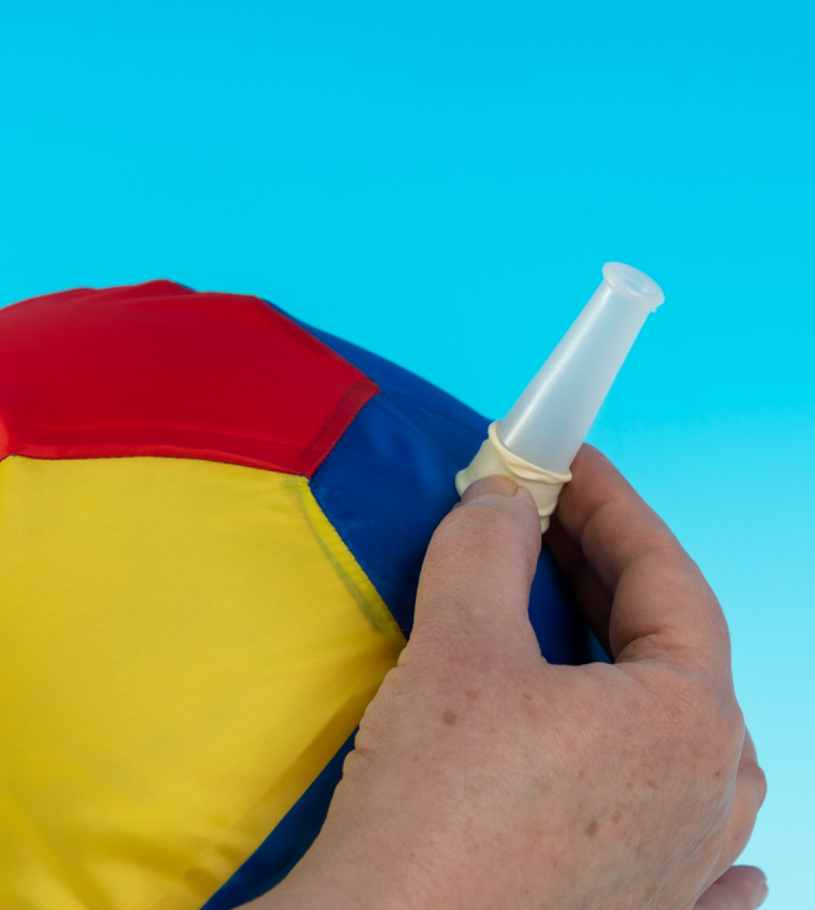När ballongen är helt uppblåst inuti nylonöverdraget knyter du en knut och stoppar in den under överdraget, alternativt försluter ballongen med en liten påsklämma.