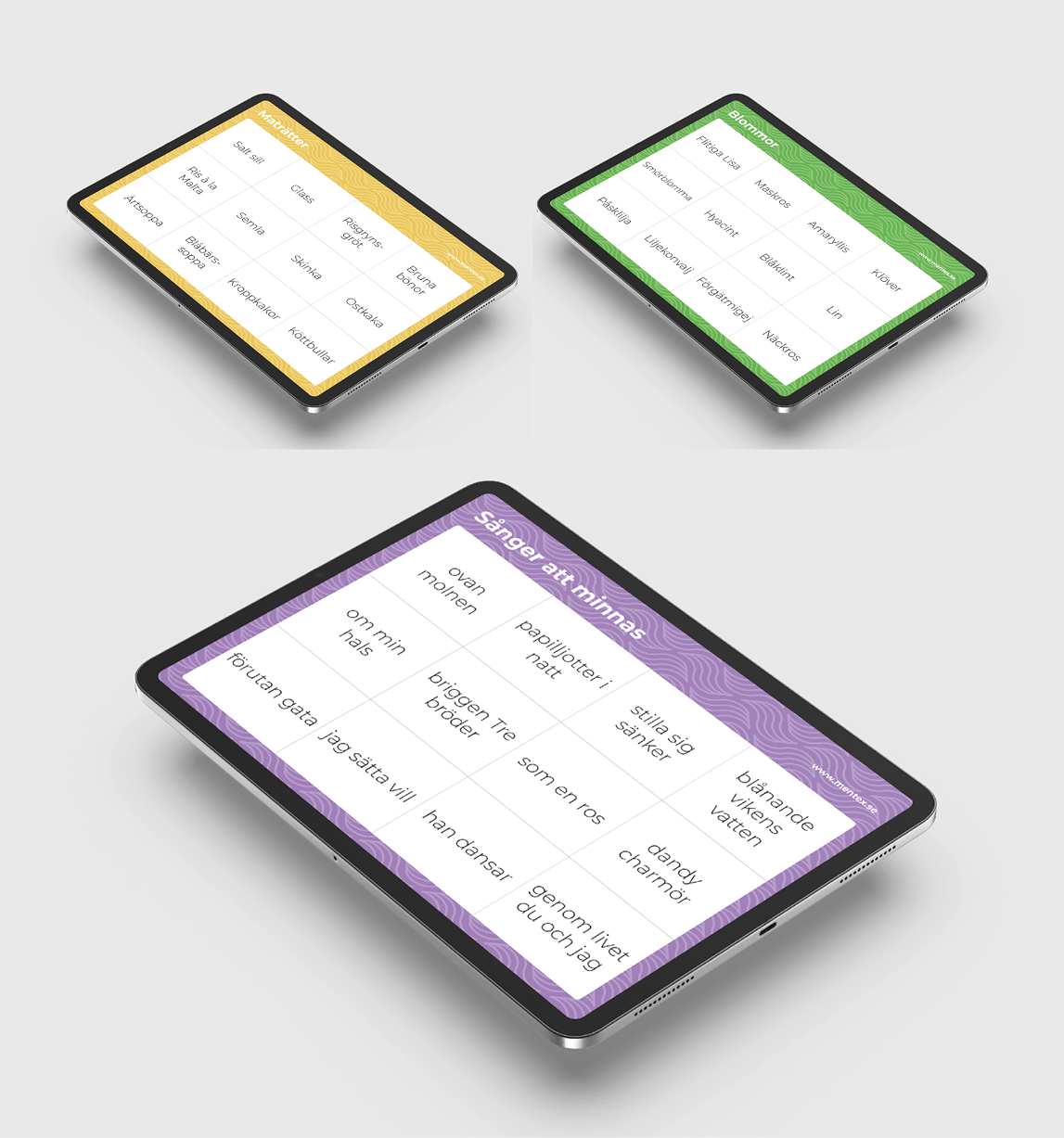 Bingo x 3 ” sånger att minnas ”, mat och blommor- pdf:er som du själv skriver ut