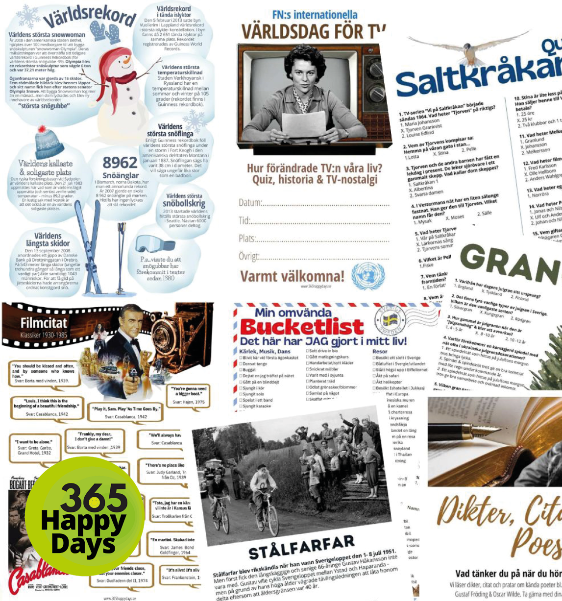 365 Happy Days är ett tidsbesparande planeringsverktyg för att organisera aktiviteter på ett smidigt sätt i äldreomsorgen. Inspirerar och ger tips på hur man kan stimulera de äldre att kommunicera med varandra och syftar till att väcka gamla minnen och lockar till skratt och diskussion. 365 Happy Days är skapat av Ankie Lidberg med 30års erfarenhet som undersköterska och aktivitetscoach inom äldreomsorgen.