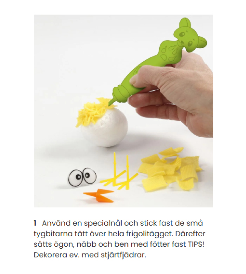 Kycklingarna görs av ett frigolitägg där tyg, i mindre bitar, sticks fast. Därefter sätts ögon, näbb och ben fast..