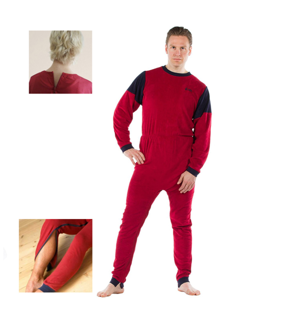 Overall i frotté med mjuk dragkedja i både gren och rygg. Hjälper till att förhindra plock med inkontinensskydd. Dragkedjan i grenen går längs hela benens innersömmar för att underlätta byte av inkontinensskydd. 100% bomull. Maskintvätt 60 grader.