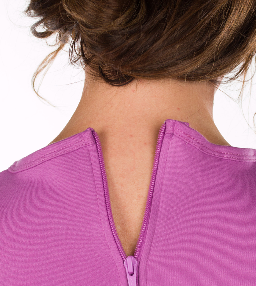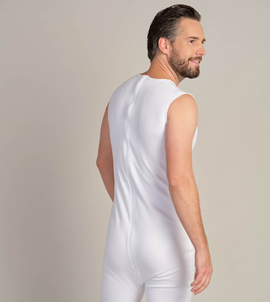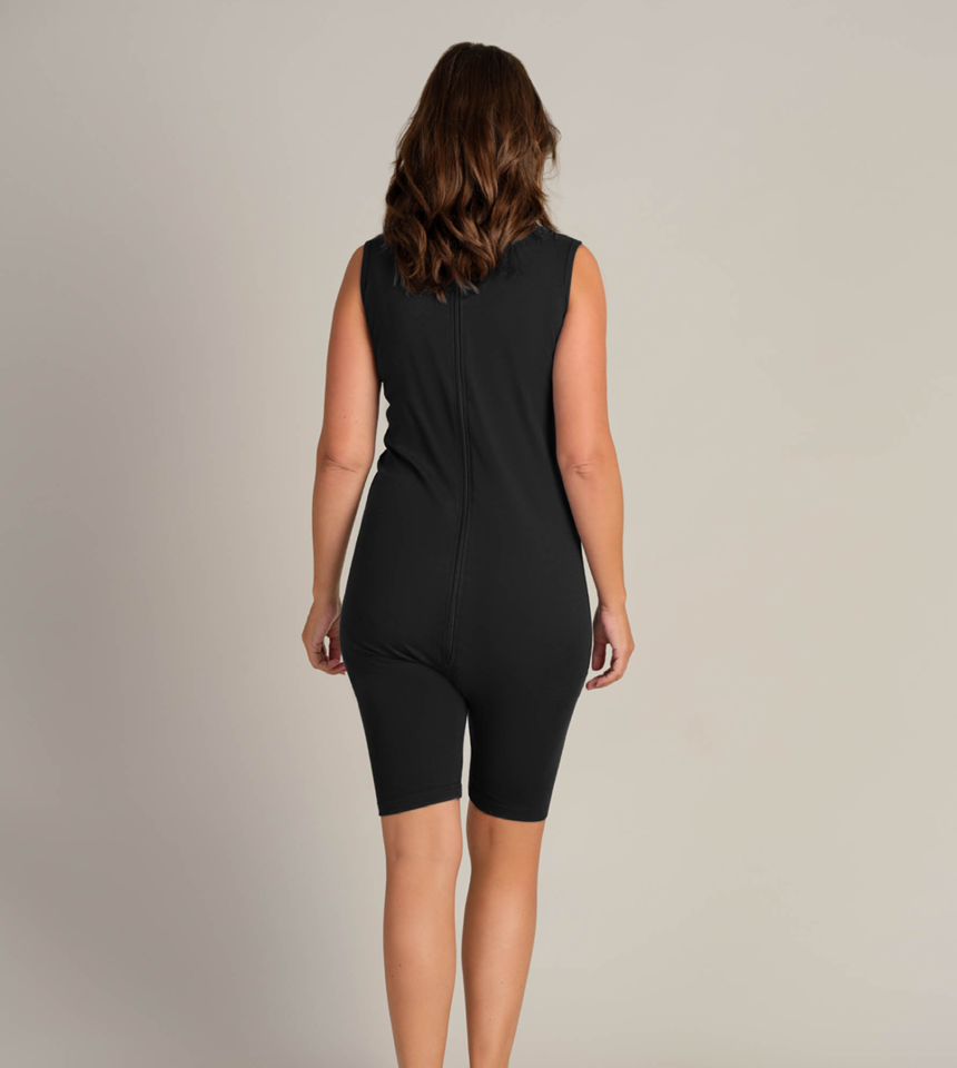 Mjuk body utan ärm och knälånga ben. Mjuk dragkedja i ryggen.