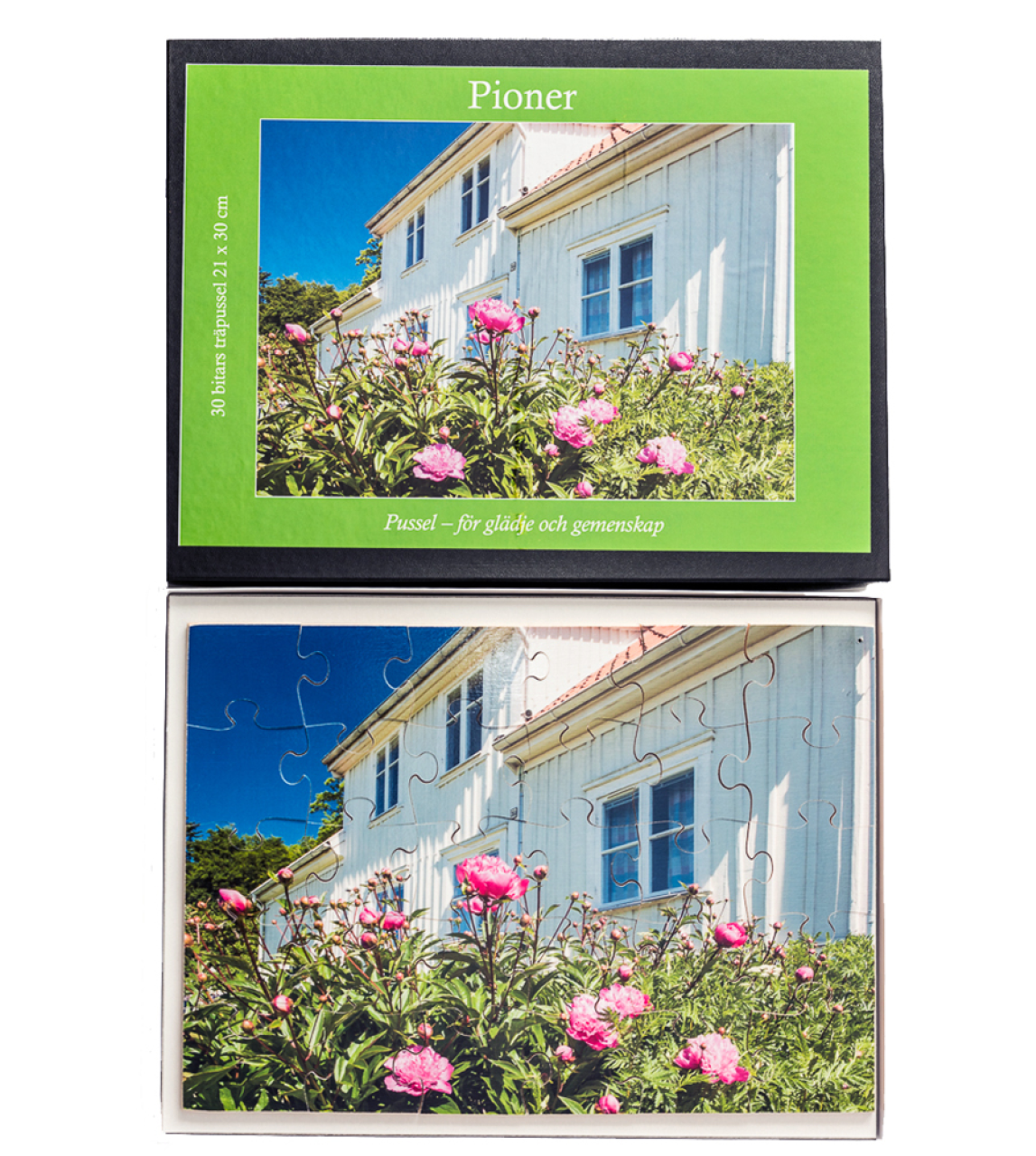 I kartongen finns också en inplastad förlaga som hjälp att pussla efter samt ett inplastat infoblad med fakta om det fotot föreställer och tips på samtalsfrågor och sinnesstimulerande aktiviteter att göra tillsammans.