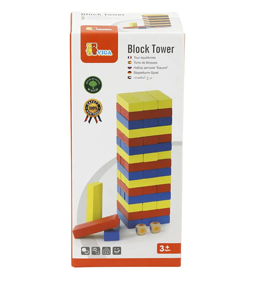Stapla klossarna i ett torn. Slå tärningen och turas om att ta bort den kloss som tärningens färg visar.
