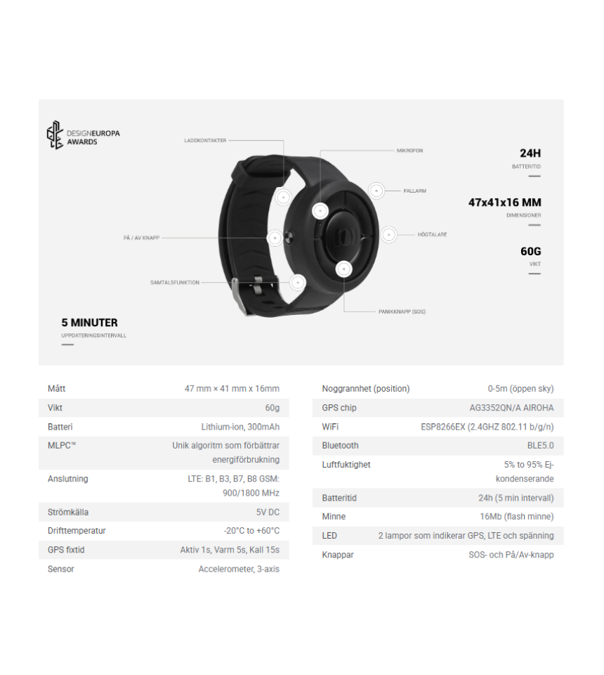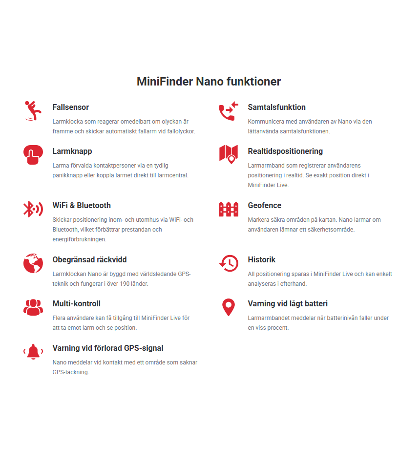 Det har också en lättåtkomlig larmknapp som enkelt kan kopplas till SOS eller annan larmcentral. Tack vare att MiniFinder Nano är ett personlarm med GPS, ökas tryggheten ytterligare. GPS-spårningen ökar din egen, ditt barns eller dina äldres trygghet. MiniFinder Nano är, tillsammans med spårnings- och larmsystemet MiniFinder Live, ett välkommet hjälpmedel som underlättar tillvaron för alla.