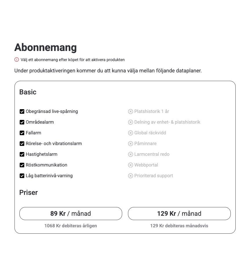 Du kommer att bli kontaktad av Minifinder för att teckna abonemang på klockan. Se bild för alternativ